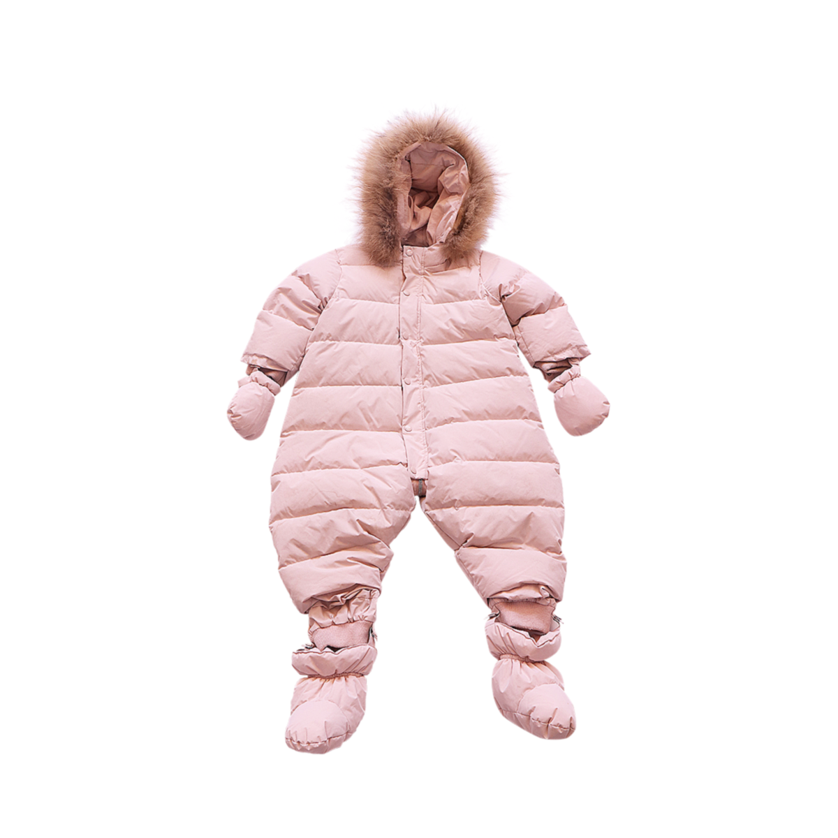 Good worn condition. Very faint stains on the leg. Removeable mittens and booties. Fur is removeable. Zip and snap closure.