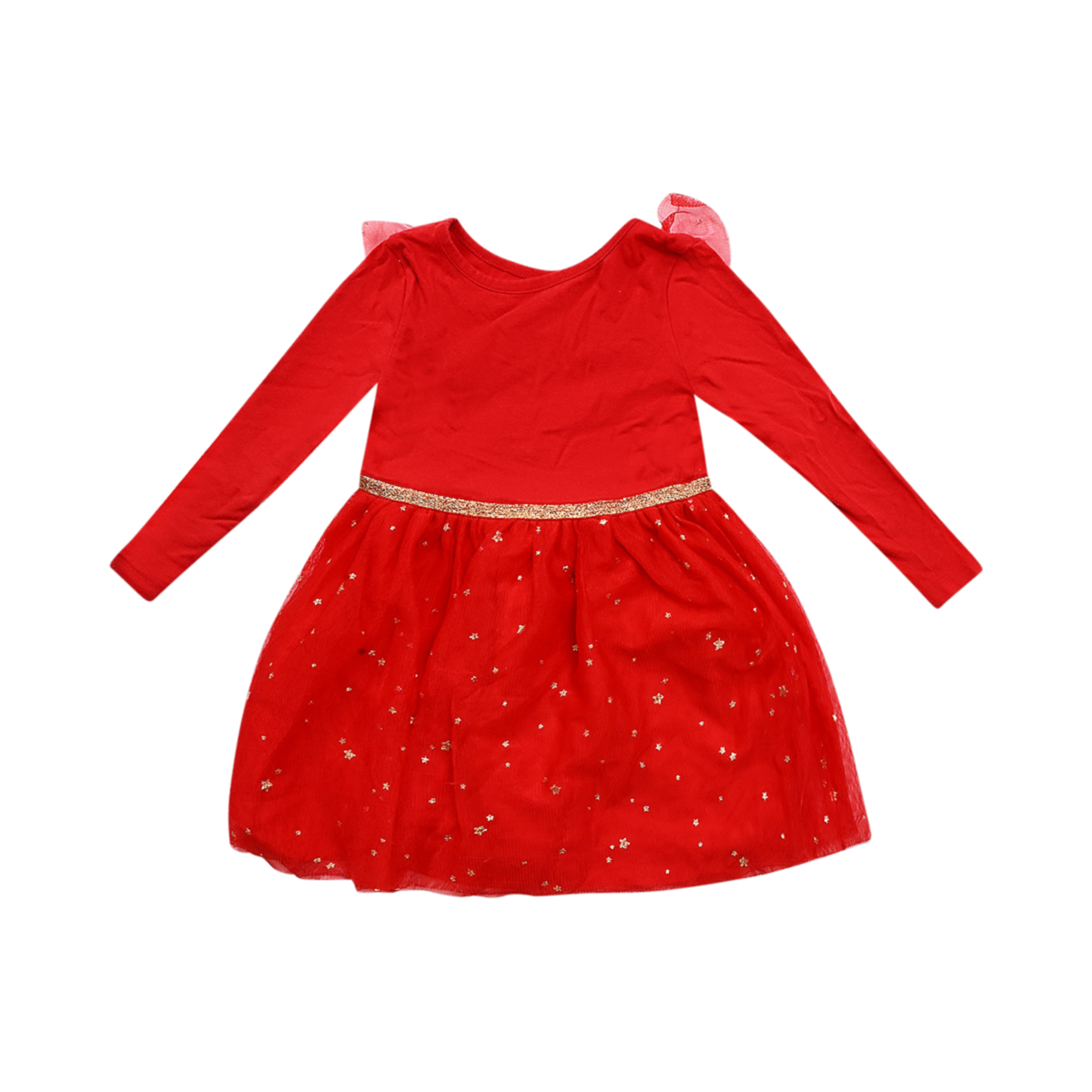Good worn condition. Small stain on bodice. Twirly tulle skirt. Ruffle details. Glittery elastic waistband.
