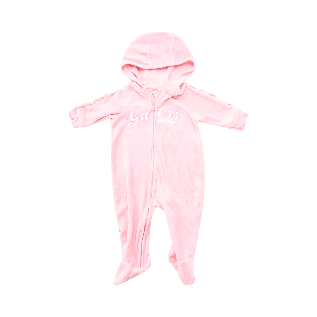Good worn condition. Attached hood. Full front zipper. Built in feet. “Guess” logo across chest.