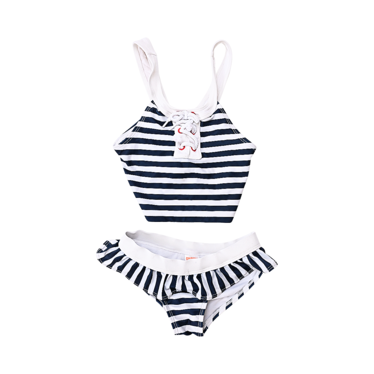 Good worn condition. Small stain. Decorative front detail. Ruffle trim detail along waistband of bottoms.