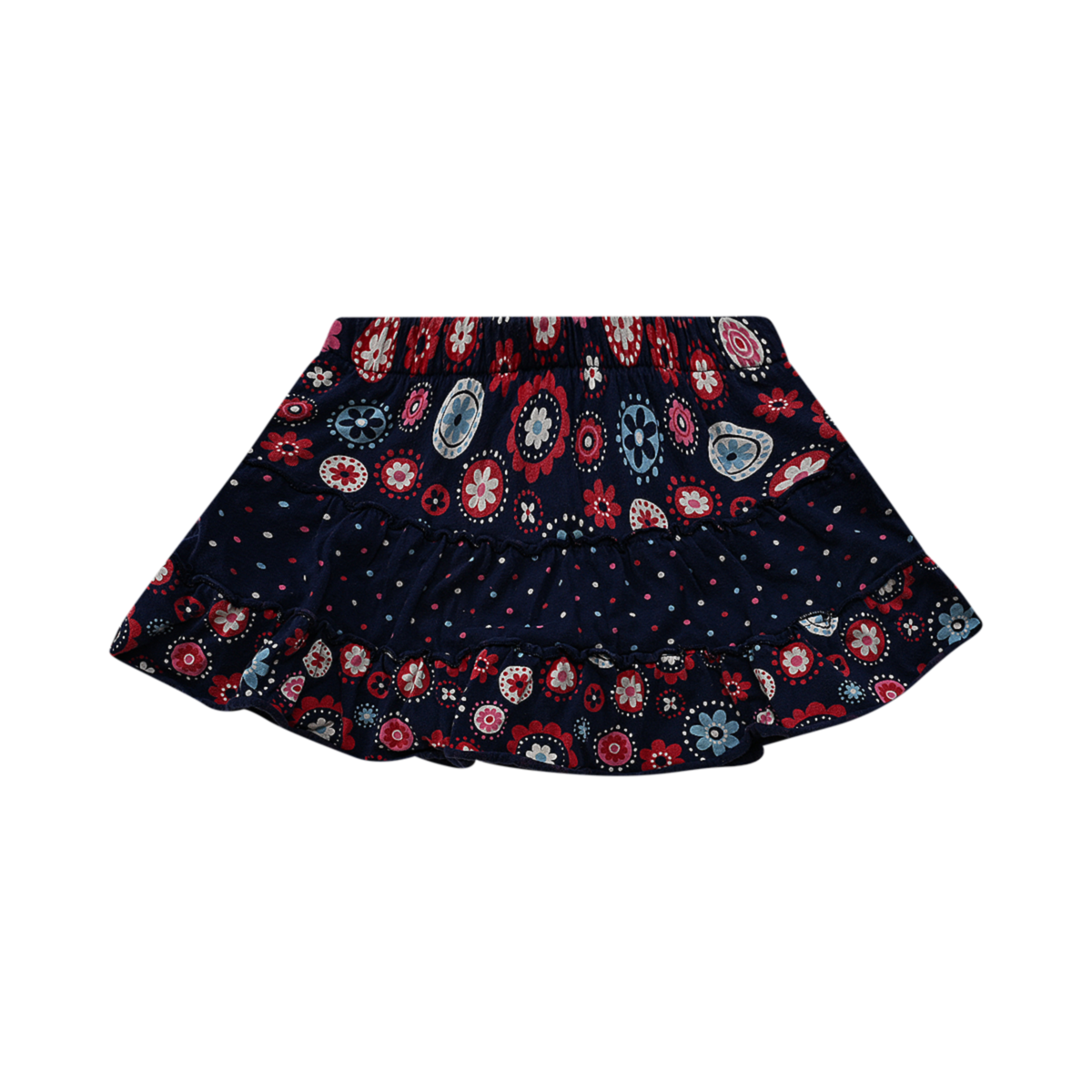 Good worn condition. Pull-on skort with built-in shorts underneath. Elastic waistband. Flared silhouette with gentle volume. Mixed motif patterns.
