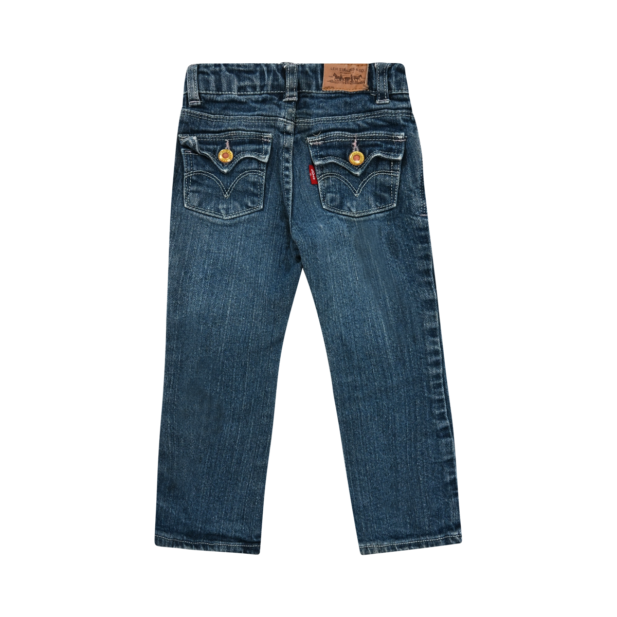 Fair worn condition. Large stain on front, somewhat blends in. Pink glitter details. Classic 5 pocket design. Flap back pockets with Levi’s logo tab. Belt loops. Button and zip fly closure.