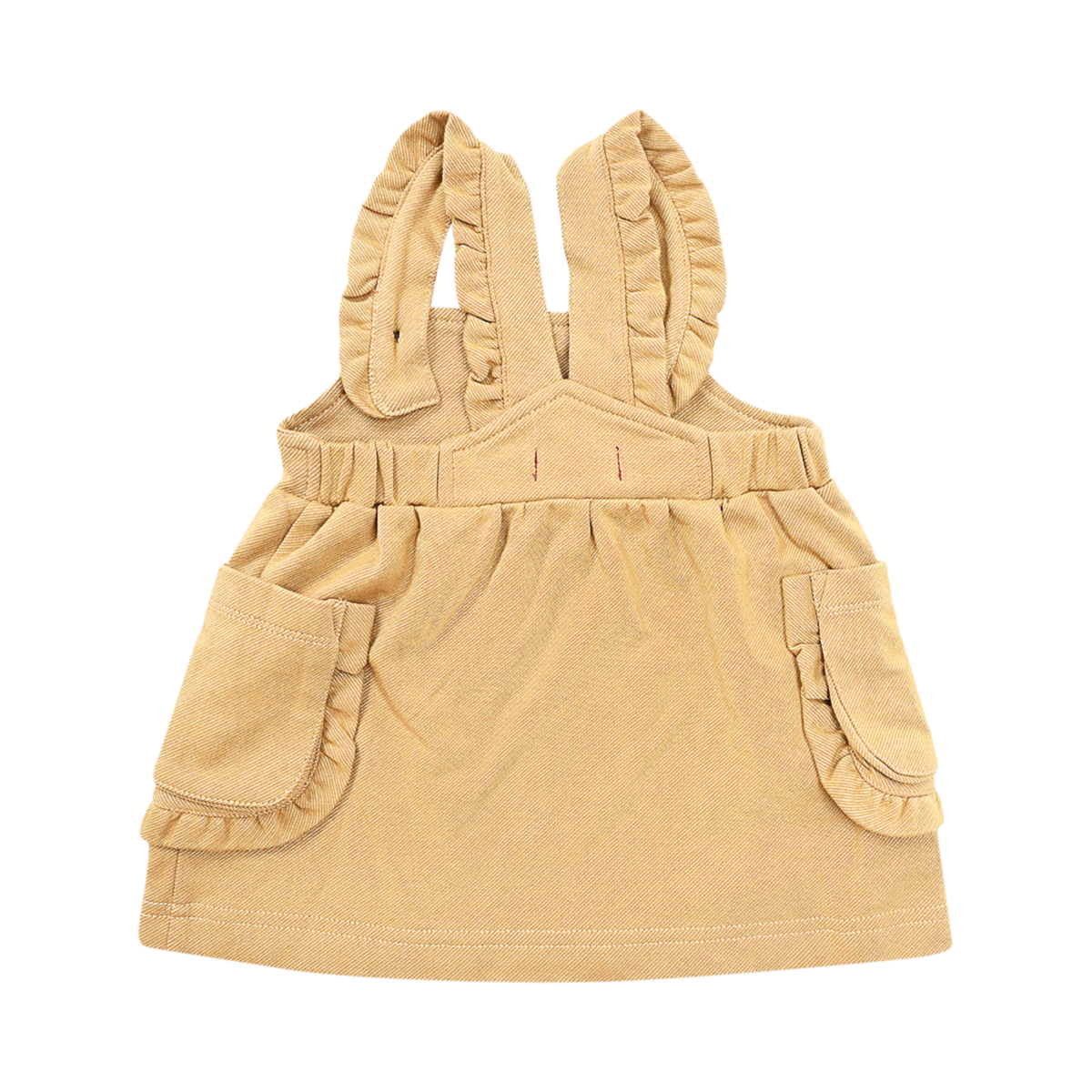 Excellent worn condition. Ruffled shoulder straps. Button front detail. Gathered waist. Ruffle-trim cargo-style pockets.