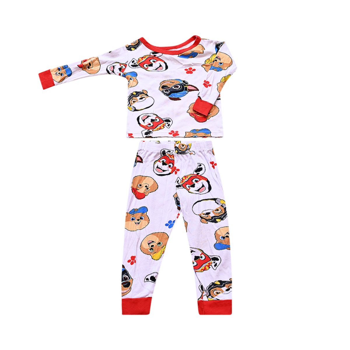 Good worn condition. Slight pilling. Paw Patrol character print. Red trim on collar, cuffs, and ankles.