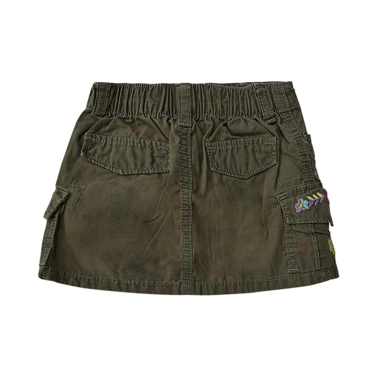 Very good worn condition. Utility-style skirt. Floral embroidery. Cargo flap pockets. Elastic waistband. Belt loops and button front detail.