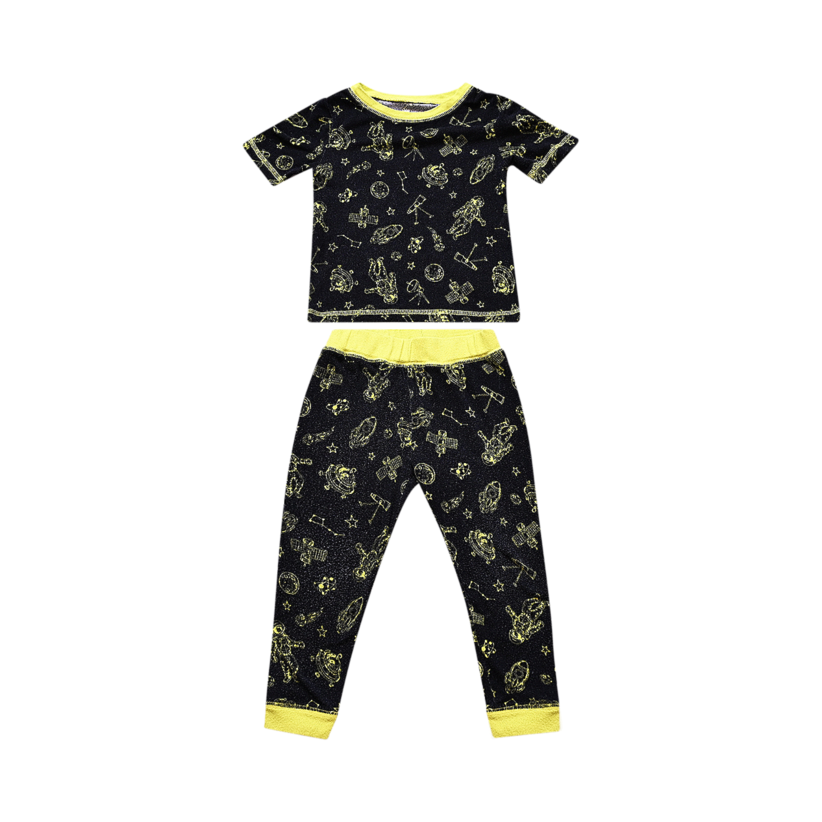 Good worn condition. Shows signs of wear. Two-piece pajama set. Space-themed print. Elastic waistband on pants.