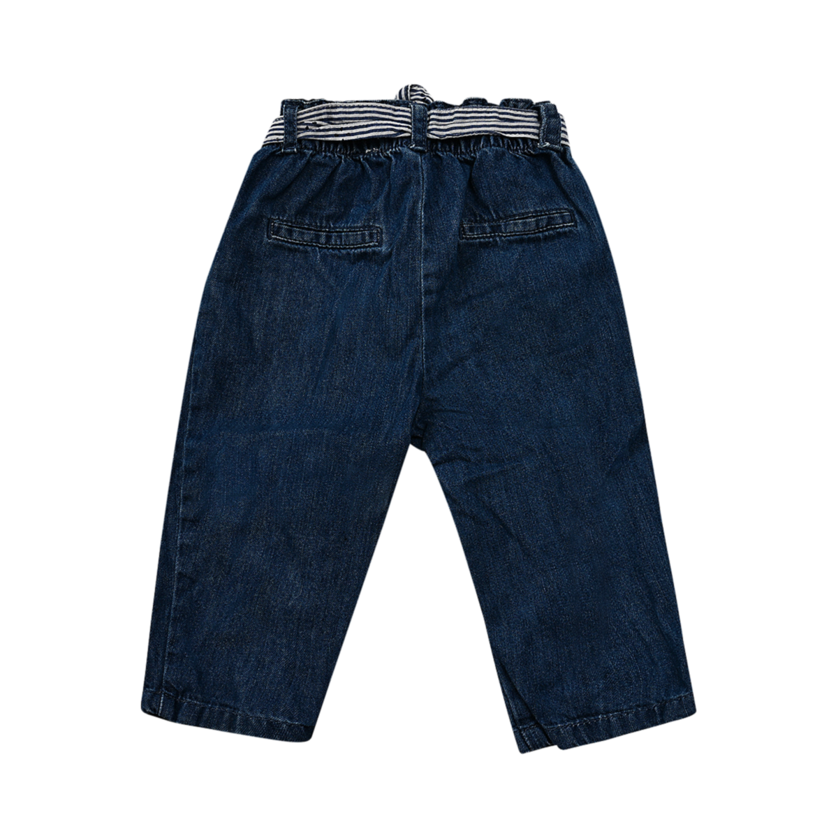 Very good worn condition. Elastic waistband and removable fabric tie belt. Front slant pockets and back welt pockets.